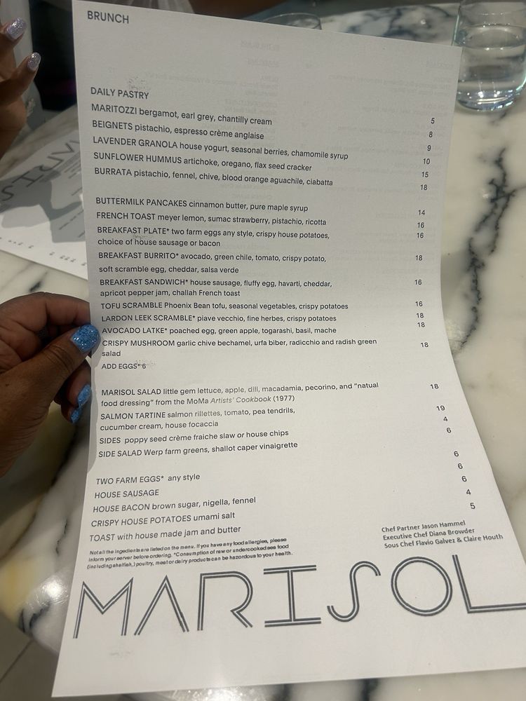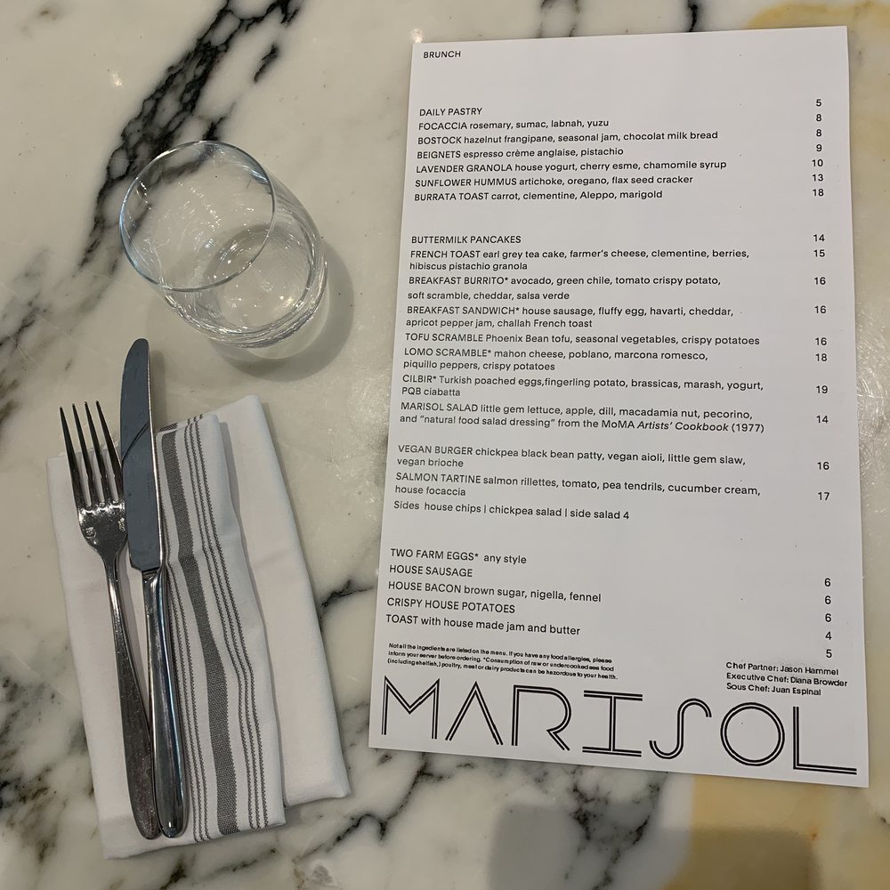 Marisol Restaurant and Bar, located in the heart of Chicago, offers a delightful menu that embodies New American cuisine. Brunch is a standout, featuring housemade pastries and unique dishes that reflect a commitment to quality and freshness. Notable highlights include the Gravlax Platter, showcasing rich flavors with seasonal pickles and dill cream cheese, and the Breakfast Burrito, which is both nourishing and flavorful with creamy avocado.